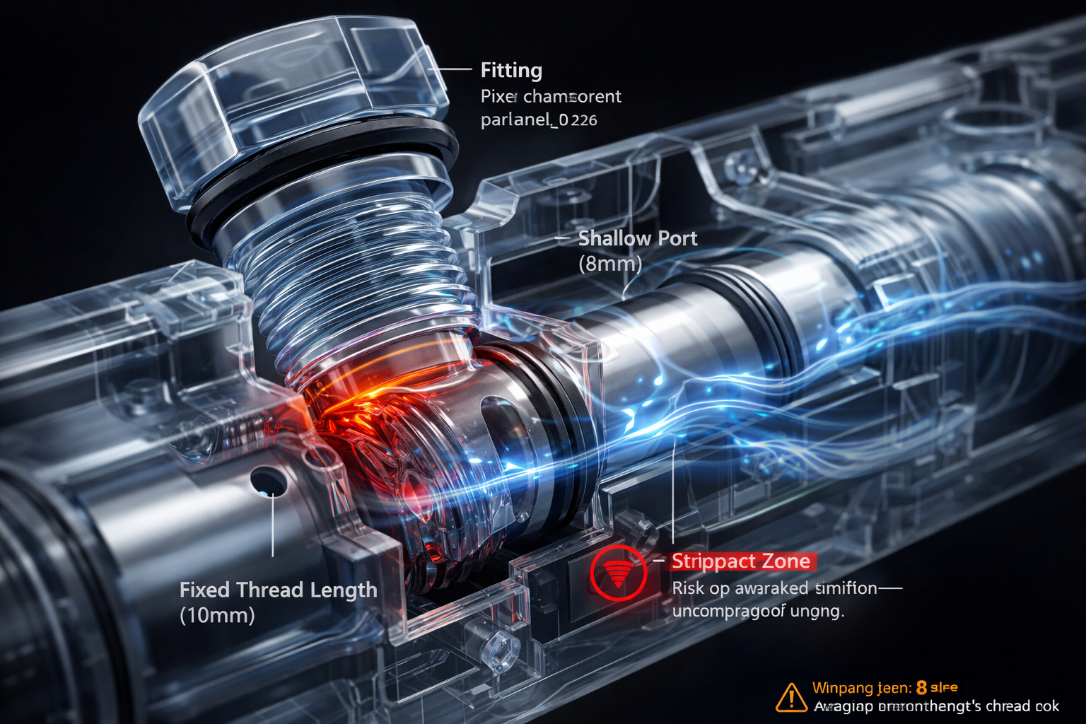 • Проблема глубины порта: У фитингов G фиксированная длина резьбы (например, 10 мм). Если порт распределителя неглубокий (8 мм), кольцо не прижмется, и монтажник, пытаясь устранить течь, просто сорвет резьбу или раздавит уплотнение.