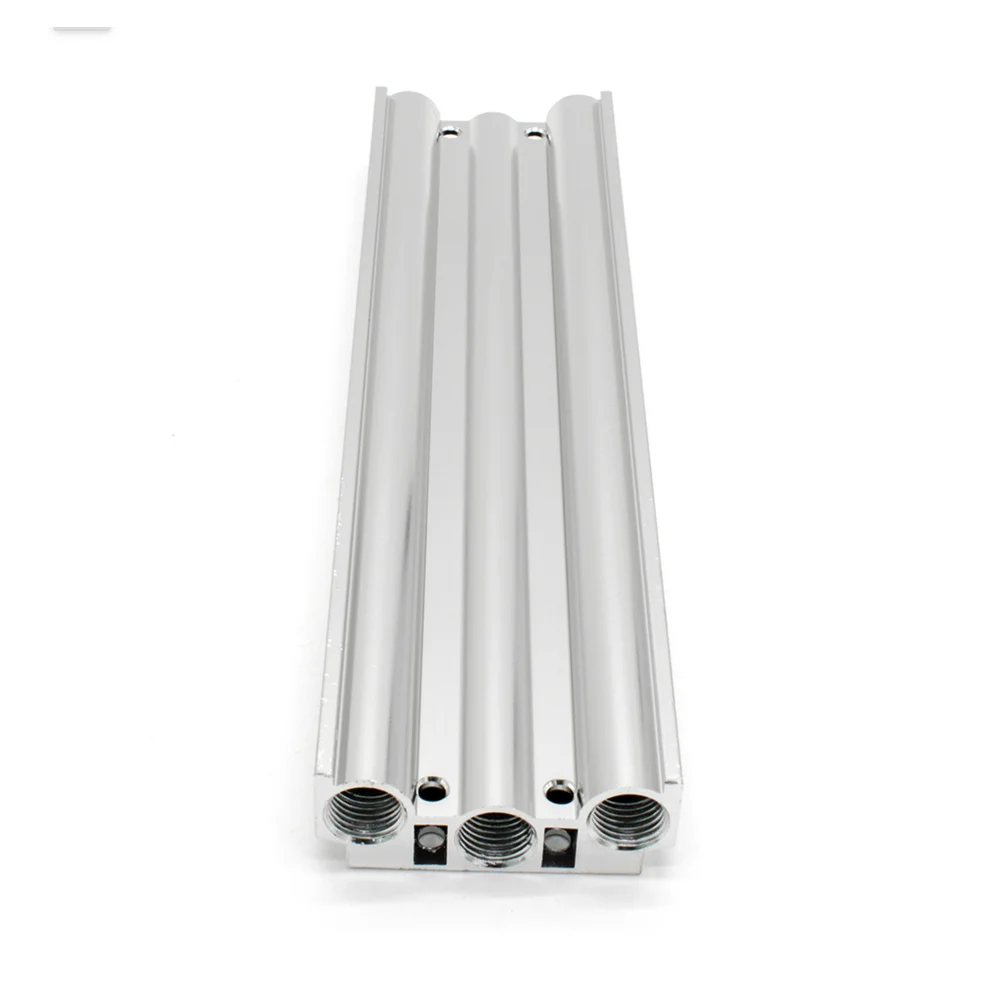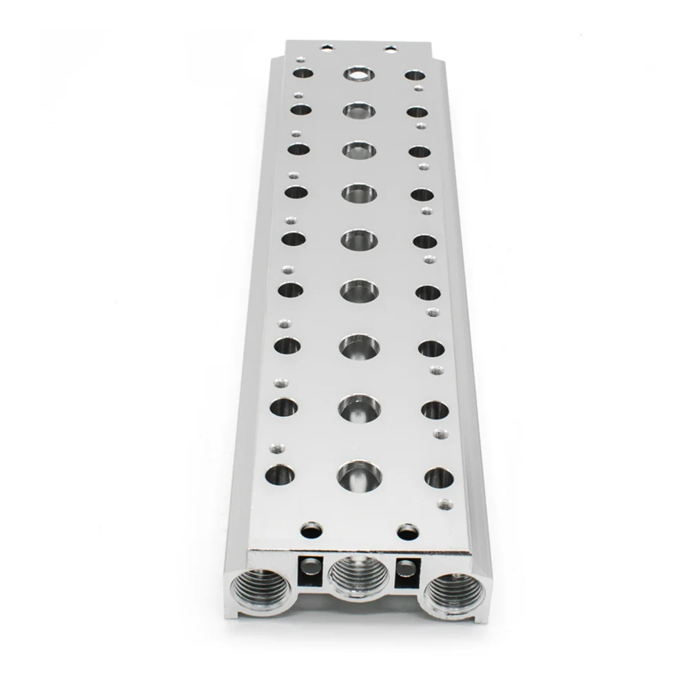 Пневмоостров 200M-9F G1/4 — алюминиевый коллектор на 9 станций для централизованной подачи сжатого воздуха и отвода выхлопа. Установка нескольких распределителей серии 4V (4V210, 4V220, 4V230) на одну плиту экономит место, упрощает разводку трубок и снижает затраты на фитинги и монтаж.