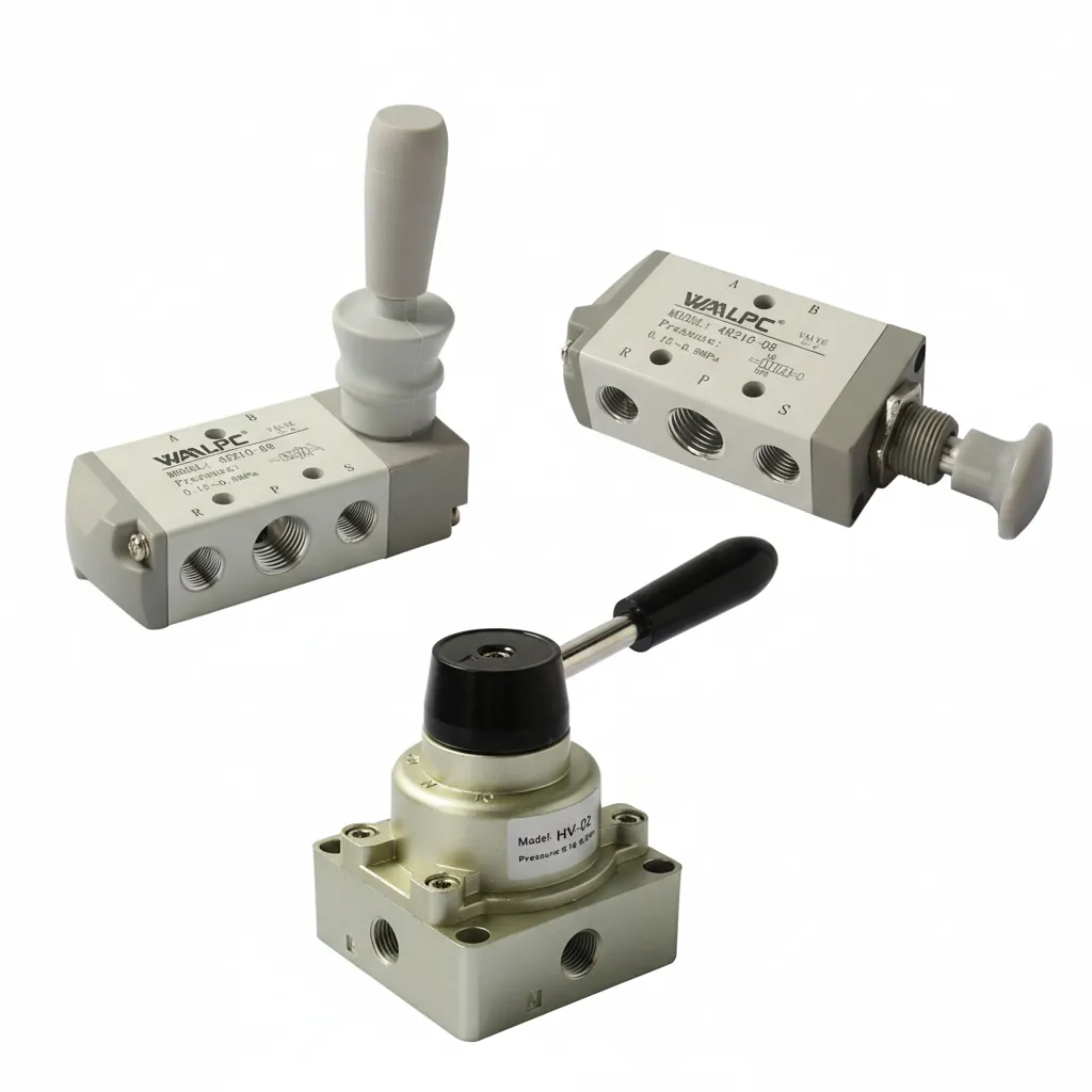 Распределители с ручным управлением: рычажные, кнопочные и поворотные модели. Для ручного режима, наладки оборудования и аварийного управления пневмосистемой.